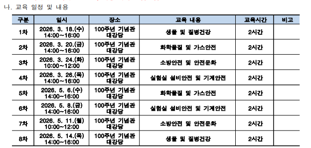 - 일반대학원생은 2026학년도 1학기 집체 안전교육 2시간 필수 이수